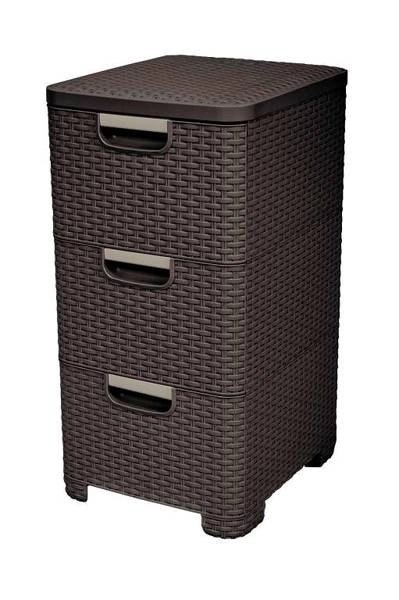 Praktyczny regał o nowoczesnym designie przyda się w każdym domu. Posiada trzy pojemne szuflady, które są wytrzymałe i co najważniejsze bardzo łatwe w czyszczeniu. Każda z nich posiada uchwyt, nie wystający poza obręb kosza. Wysokiej jakości materiał, z którego jest zrobiony przypomina w swojej strukturze popularny rattan, który idealnie wpisuje się w każdy wystrój wnętrz.