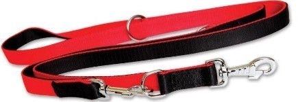 Smycz dla psa przepinana z podwójnej taśmy polipropylenowej w czerwono-czarnym kolorze. Długość 220cm i szerokość 2,5cm.