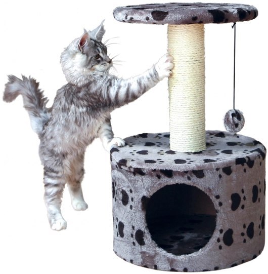 Wielofunkcyjny drapak dla kota. Zapewnia miejsce do schowania, do spania, do zabawy, do drapania. Posiada pluszowe obicie. Legowisko wyłożone pluszem. Słupek owinięty naturalnym sizalem. Posiada zabawkę na sznurku. Drapak Toledo szary w łapki to doskonała zabawka i legowisko w jednym urządzeniu. Sam dół zabawki Toledo służy do odpoczywania, chowania się, środek to powierzchnia do drapania. Drapanie pozwala im rozładować emocję, znaczyć terytorium oraz ścierać pazurki. Kolejny poziom drapaka stojącego to zabawka na sznurku - piłeczka futrzana, którą kot może się samodzielnie bawić poprzez wprawianie w ruch zabawki zapewnia sobie odpowiednią rozrywkę typową dla jego gatunku - myśliwego.