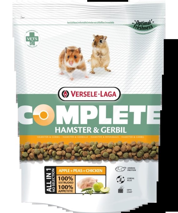 Versele-Laga Complete Hamster & Gerbil to żywienie bez zmartwień. Niezwykle smaczne ekstrudaty przygotowane wg koncepcji "wszystko w jednym" zapobiegają selektywnemu pobieraniu pokarmu. Dzięki temu Twój chomik albo myszkoskoczek otrzymuje wszystkie niezbędne substancje odżywcze pozwalające mu cieszyć się pełnią zdrowia. Pokarm zawierający kurczaka, jako naturalne źródło zwierzęcych protein oraz zboża dające energię i witalność dostosowany jest do potrzeb żywieniowych chomików i myszkoskoczków. Skład wzbogacony warzywami i owocami. Zawiera m in. wyciąg z jukki, co redukuje nieprzyjemny zapach. Olej z łososia i siemię lniane jako źródło kwasów omega 3 i omega 6. Zapewniają piękną okrywę włosową.