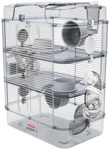 Nową gamę modułowych klatek dla małych gryzoni (chomików, myszy i myszoskoczków) RODY.3 charakteryzuje nowe wzornictwo: zmieniono dno i górną część klatki, dodając elementy plastikowe w kolorze jasnej szarości.